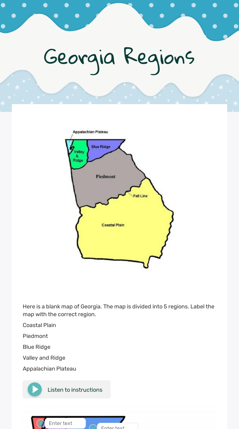 Learn about the blue ridge mountain region of georgia, including how it was formed, its climate, wildlife, location, and industry. I was needing something to review the georgia regions, rivers and a few map skills with my 2nd graders. Of the piedmont and coastal plain. Georgia's capital city, atlanta, can be found in what region? Distinguish among the five geographic . Ss8g1 describe georgia's geography and climate. Fill out this fun worksheet on the 5 regions of georgia! Terms region, erosion, fault, elevation,. (this is also the region we live in.) answer choices. Curriculum map (from georgia standards.org). The 2 types of adaptations are physical (appearance) and behavioral (doing things). Georgia studies for georgia students. I created this scoot game.